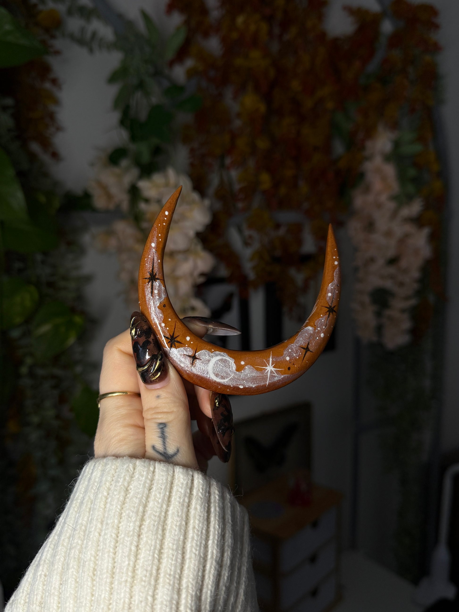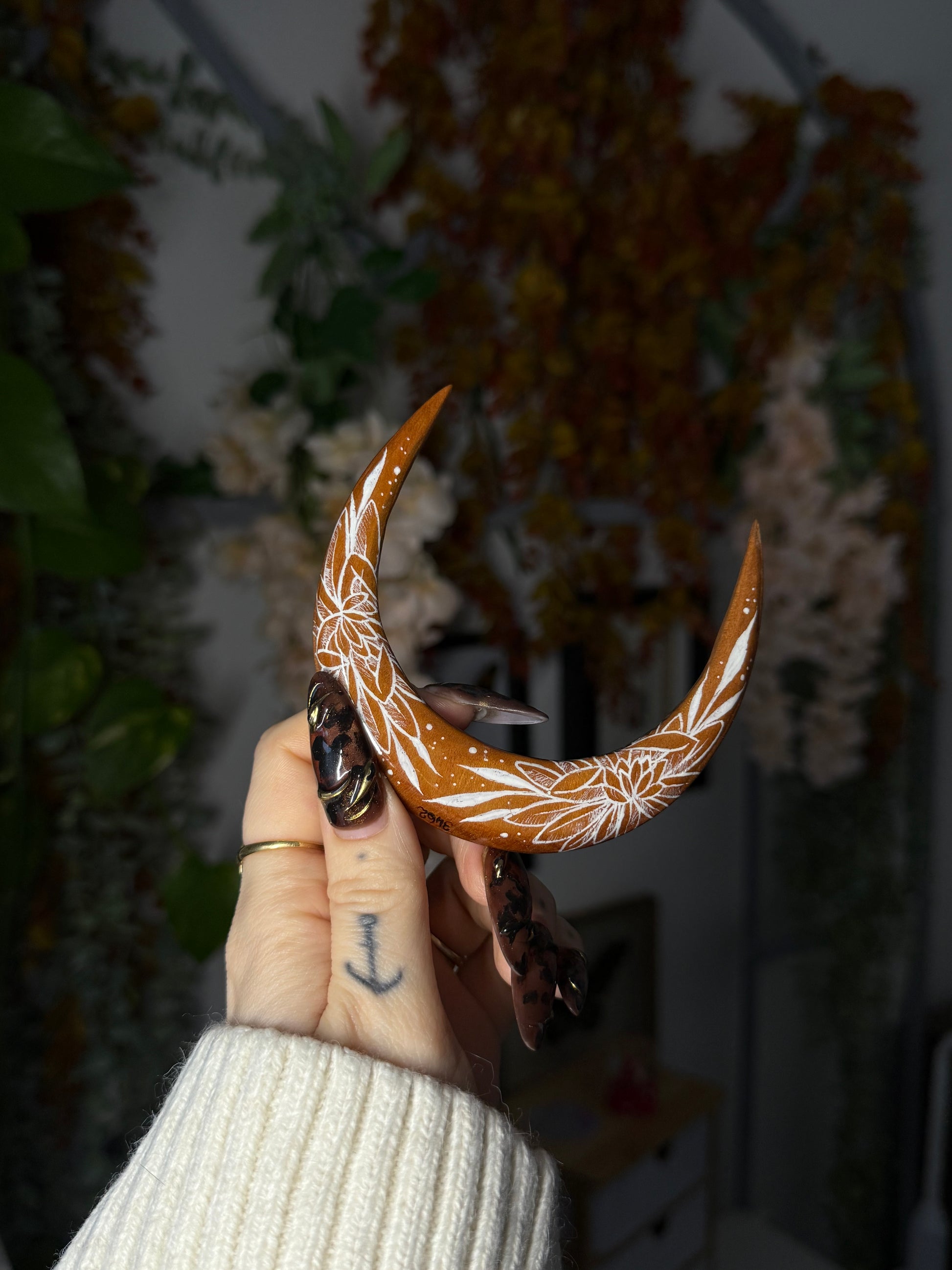 Cette broche en essence de merisier, peinte de chrysanthèmes et de nébuleuses blanches était de base une commande personnalisée qui a été refusé. A juste titre car je me suis trompé de couleurs 🤭